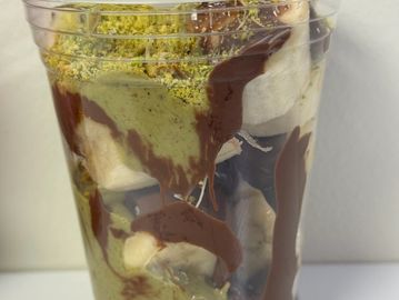 PISTACHIO SAUCE WITH CRISPY KATAIFL,CHOCOLATE SAUCE,FRESH BANANAS, CHOPPED PISTACHIO ON TOP